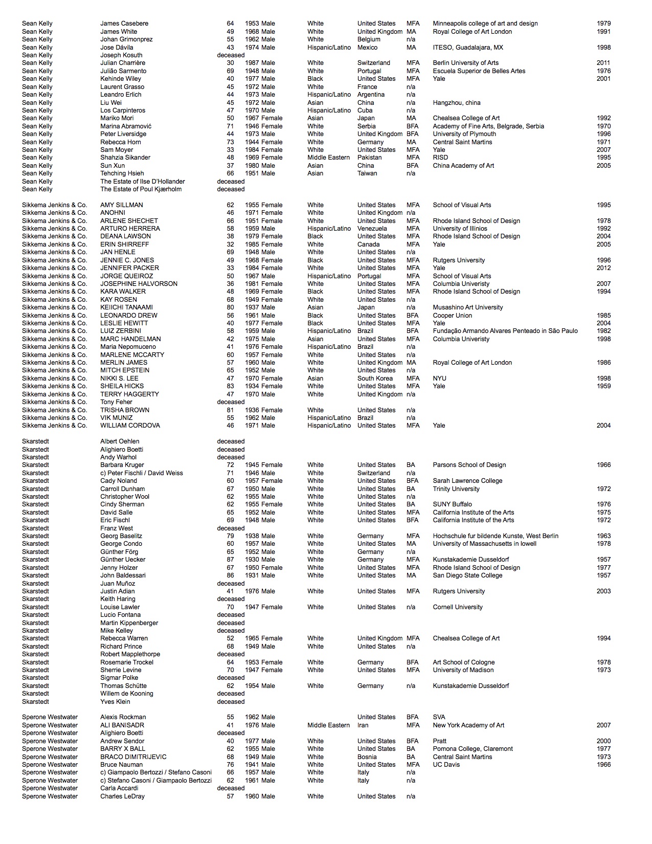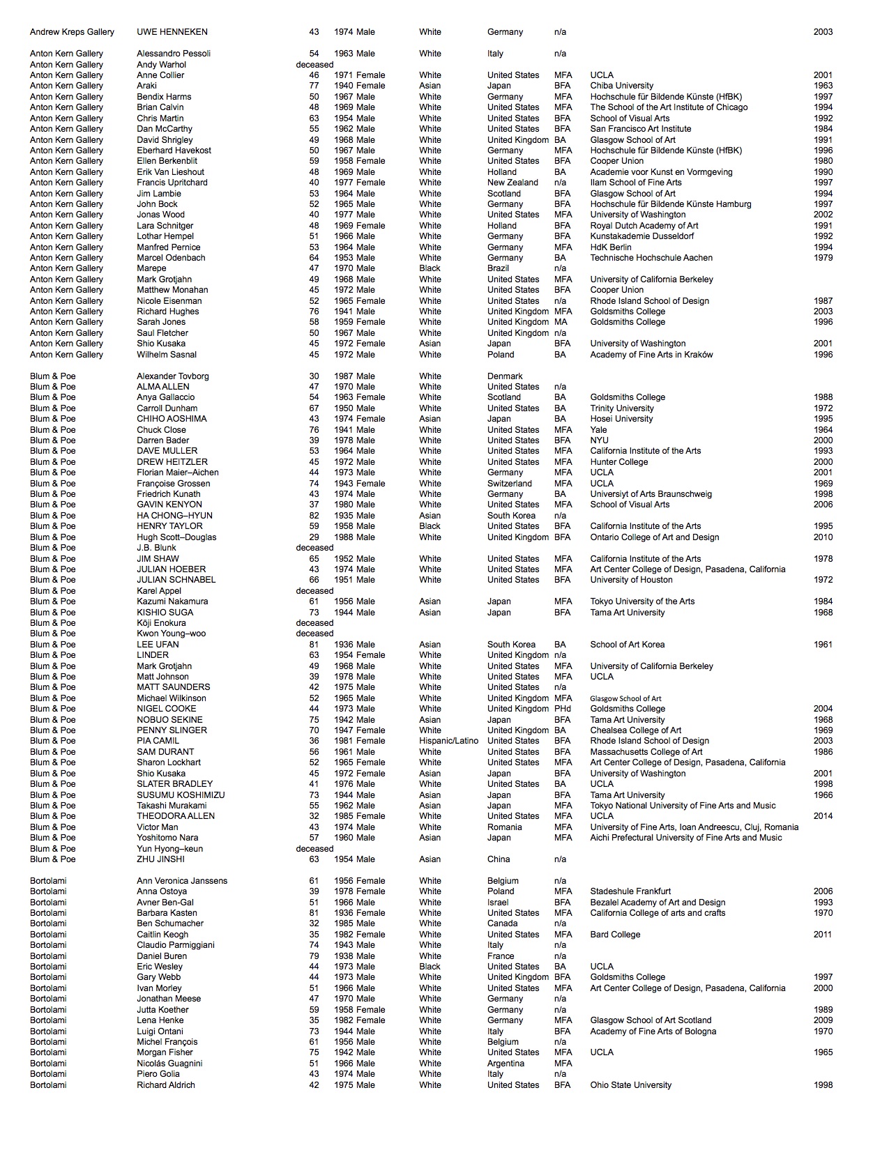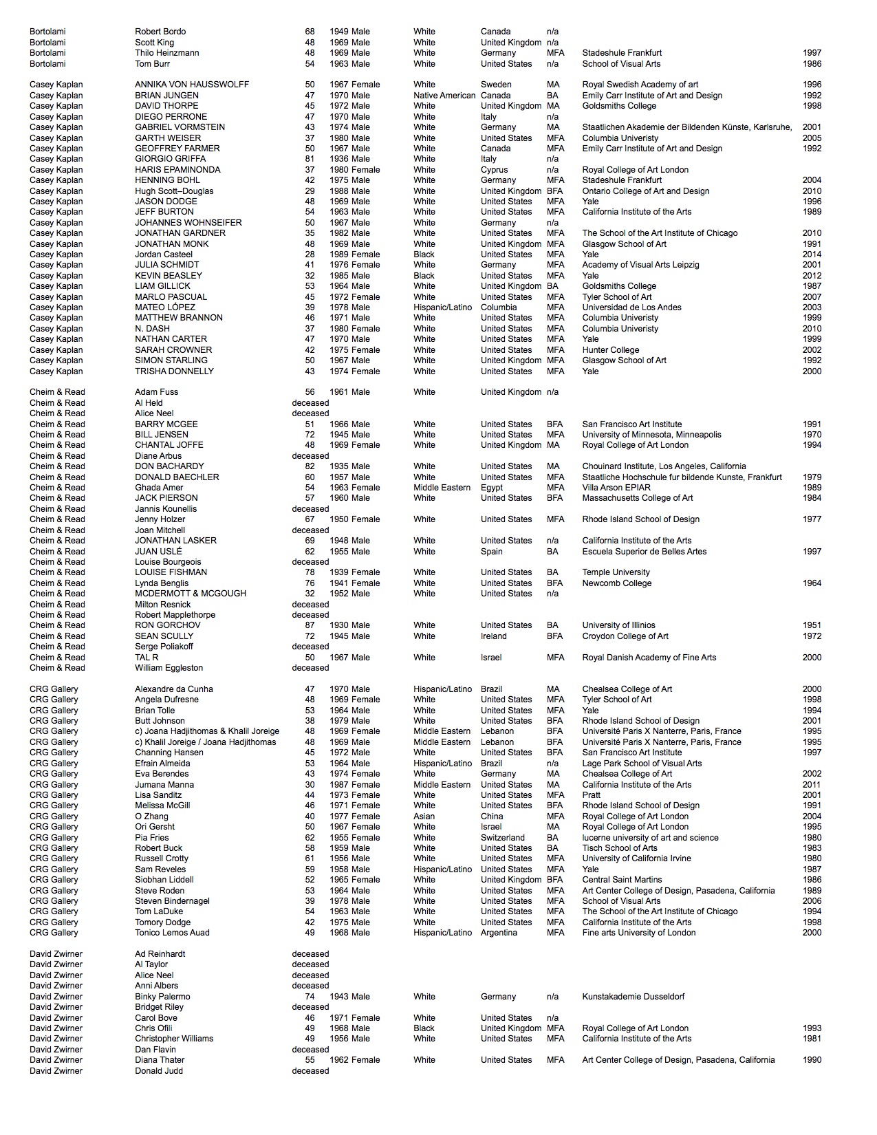 Gallery rosters change frequently. The data listed is of the artists represented as of fall 2016. In the time since this project has concluded two of the galleries have permanently closed: Andrea Rosen Gallery and CRG.