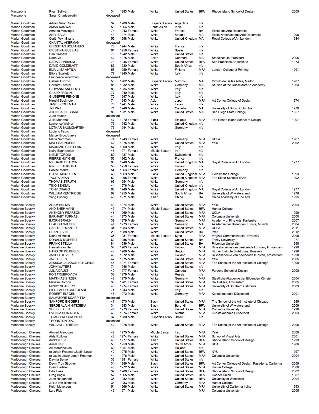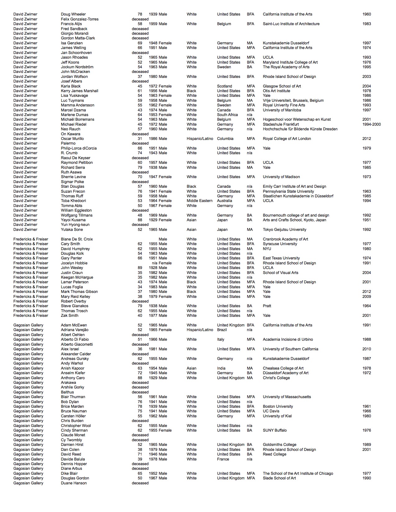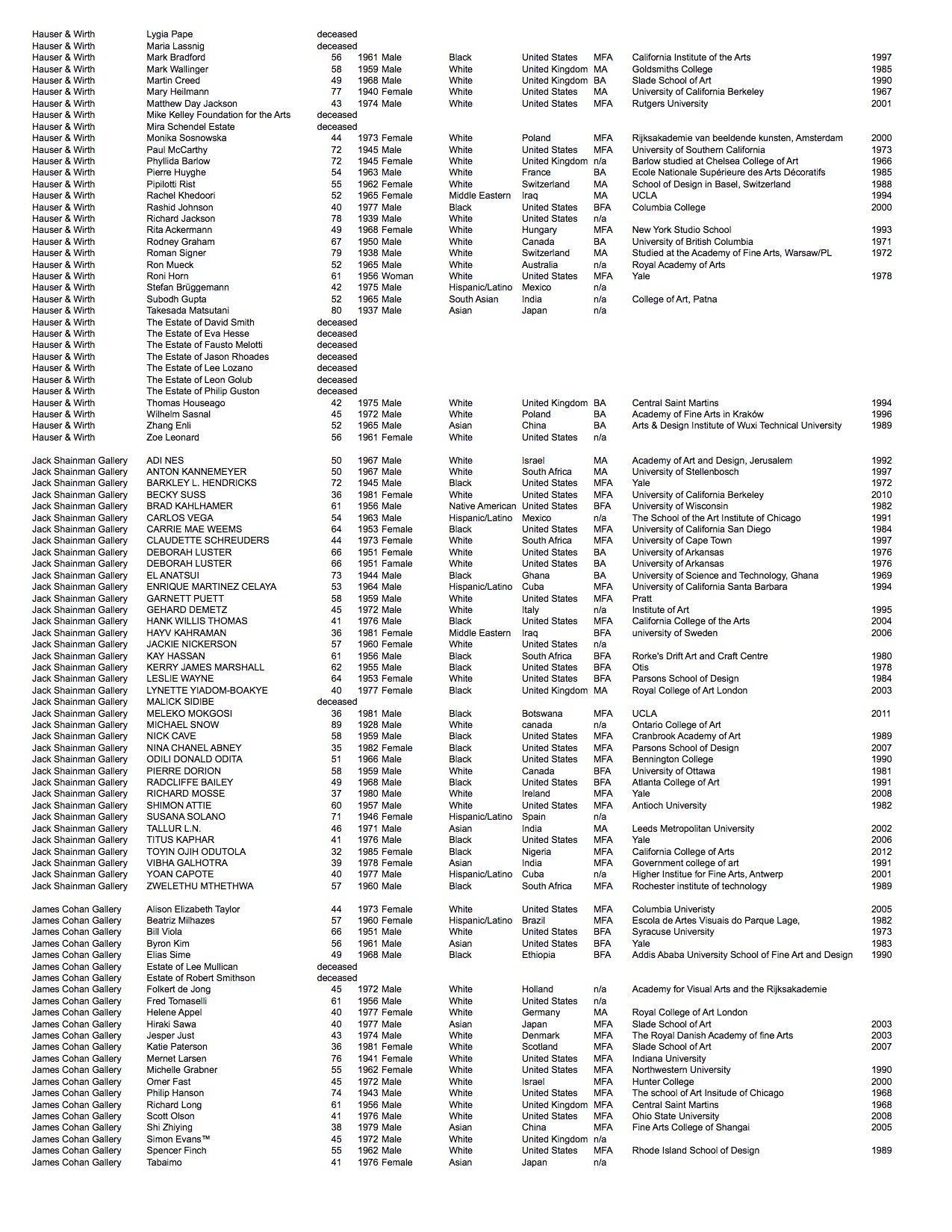 Gallery rosters change frequently. The data listed is of the artists represented as of fall 2016. In the time since this project has concluded two of the galleries have permanently closed: Andrea Rosen Gallery and CRG.