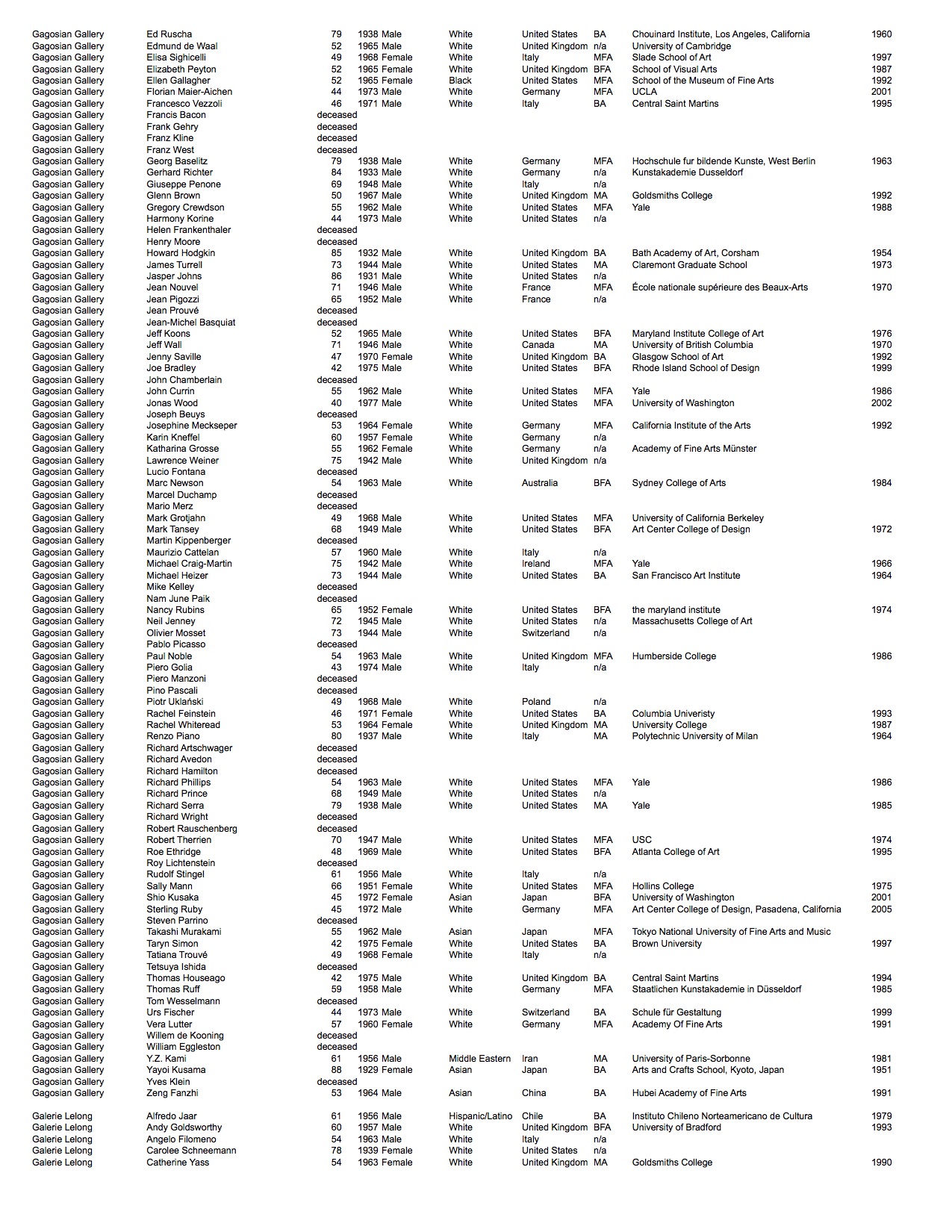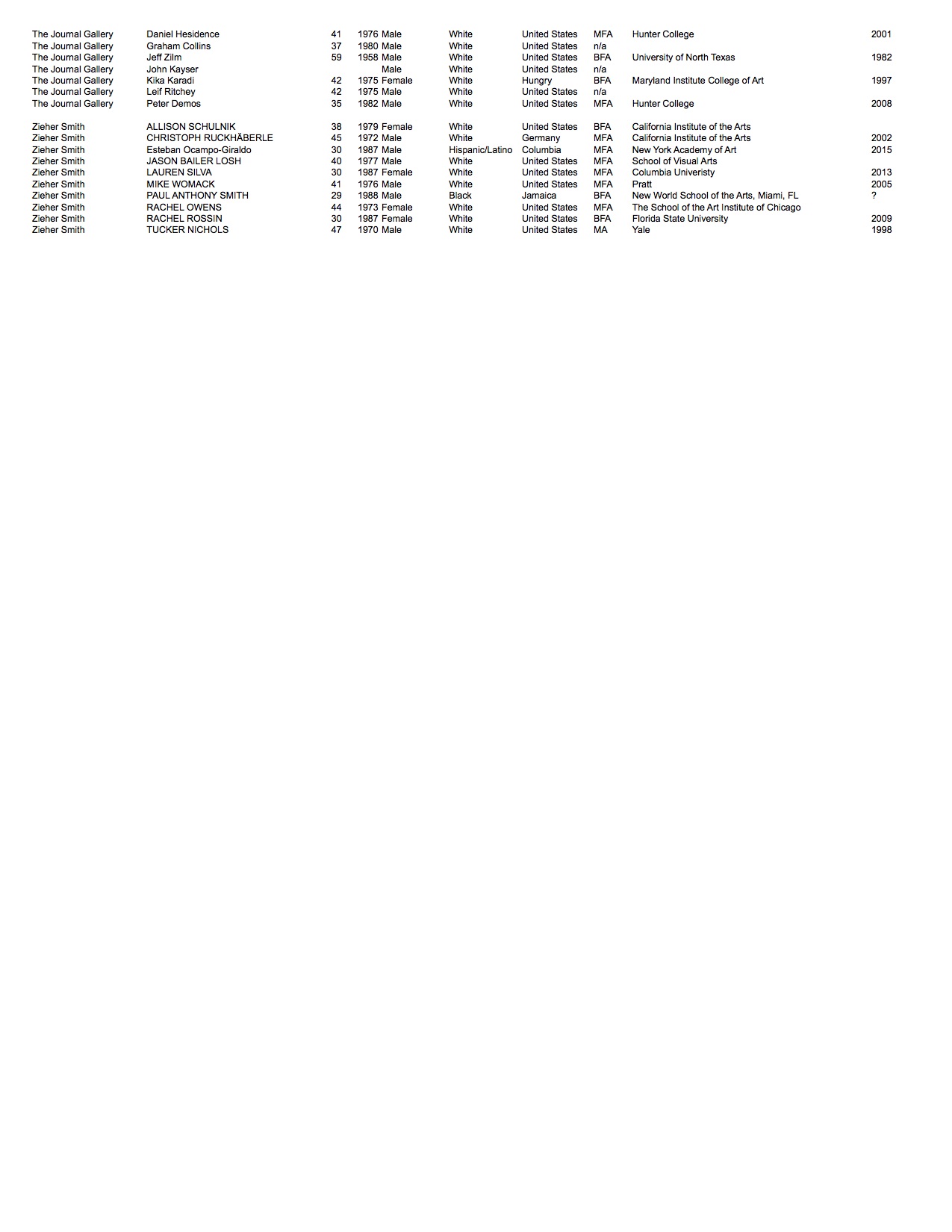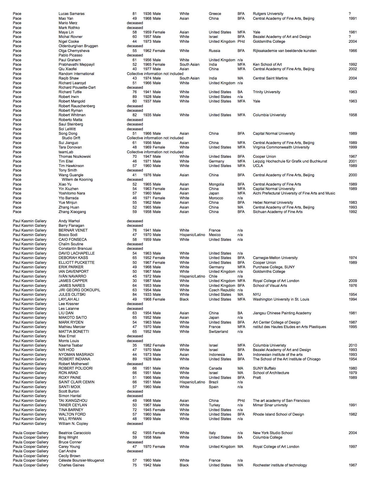 We looked at each artist publicly represented by the galleries and recorded available biographical information: looking at age, nationality, highest level of education, where they attended, graduation year, their perceived gender*, and race*.