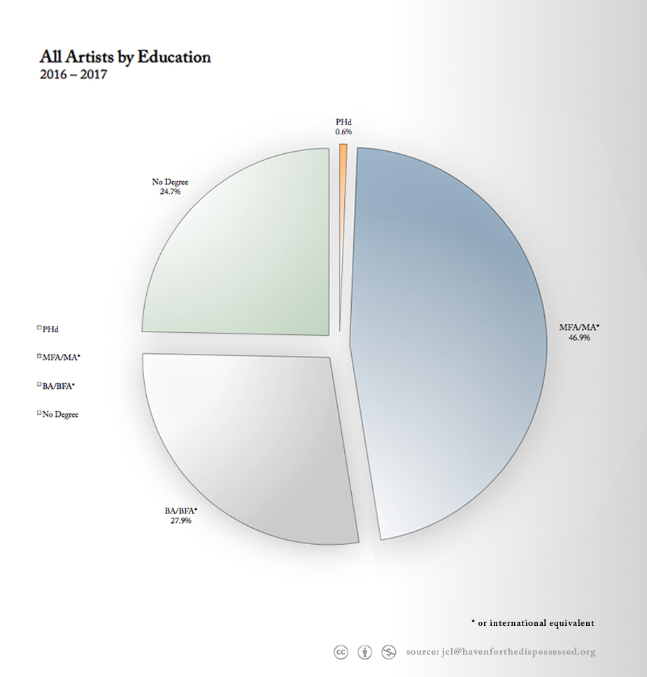 We built a database of 1300 artists represented at the top 45 commercial galleries in New York. We researched each artist noting their: Age, Race*, Nationality, Gender*, and Education (highest degree, institution, and date of graduation).